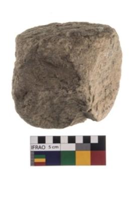 | Description / विवरण | A partially broken specimen of a hammerstone made of quartzite, It is irregularly oval in shape with rough surface. |