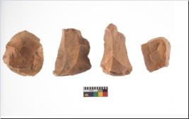 | Description / विवरण | Four utilised worked cores with sharp edges. Flakes removed from almost all the sides. Some are tapering at one end. |
