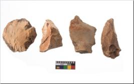 | Description / विवरण | Four utilised worked cores with sharp edges. Flakes removed from almost all the sides. Some are tapering at one end. |