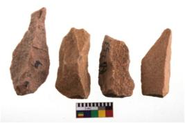 | Description / विवरण | Specimen of flake tool with prominent flaking marks. They are made up of a short flakes with sides trimmed. |