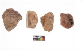| Description / विवरण | Four utilised worked cores with sharp edges. Flakes removed from almost all the sides. Some are tapering at one end. |