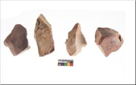 | Description / विवरण | Four utilised worked cores with sharp edges. Flakes removed from almost all the sides. Some are tapering at one end. |