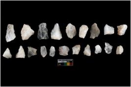 | Description / विवरण | There are n-20 of intact flake cores made up of Quartz. Some of them have bulge of percussion and some are flat flakes. |