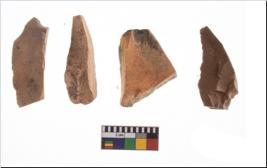 | Description / विवरण | Four utilised worked cores with sharp edges. Flakes removed from almost all the sides. Some are tapering at one end. |