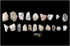 | Description / विवरण | There are n-20 of intact flake cores made up of Quartz. Some of them have bulge of percussion and some are flat flakes. |