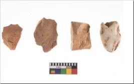| Description / विवरण | Four utilised worked cores with sharp edges. Flakes removed from almost all the sides. Some are tapering at one end. |