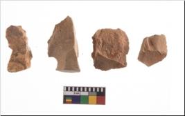 | Description / विवरण | Four utilised worked cores with sharp edges. Flakes removed from almost all the sides. Some are tapering at one end. |