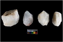 | Description / विवरण | Four utilised worked cores with sharp edges. Flakes removed from almost all the sides. Some are tapering at one end. |