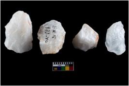 | Description / विवरण | Four utilised worked cores with sharp edges. Flakes removed from almost all the sides. Some are tapering at one end. |