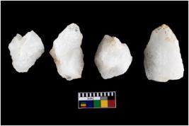 | Description / विवरण | Four utilised worked cores with sharp edges. Flakes removed from almost all the sides. Some are tapering at one end. |