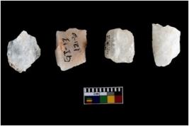| Description / विवरण | Four utilised worked cores with sharp edges. Flakes removed from almost all the sides. Some are tapering at one end. |