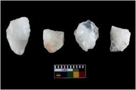 | Description / विवरण | Four utilised worked cores with sharp edges. Flakes removed from almost all the sides. Some are tapering at one end. |