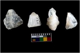 | Description / विवरण | Four utilised worked cores with sharp edges. Flakes removed from almost all the sides. Some are tapering at one end. |