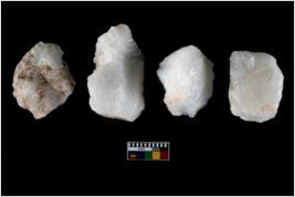 | Description / विवरण | Four utilised worked cores with sharp edges. Flakes removed from almost all the sides. Some are tapering at one end. |