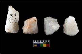 | Description / विवरण | Four utilised worked cores with sharp edges. Flakes removed from almost all the sides. Some are tapering at one end. |