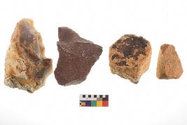 | Description / विवरण | There are n-4 of utilized flake cores. Out of them 3 are made up of Sandstone and 1 is made up of Quartzite. There are multidirectional irregular dominant scar pattern on both dorsal and ventral face of the cores. Some of them bulge of percussion and some are flat flake cores. |