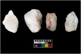 | Description / विवरण | Four utilised worked cores with sharp edges. Flakes removed from almost all the sides. Some are tapering at one end. |