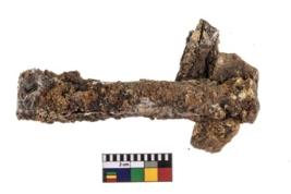 | Description / विवरण | A partially broken specimen of a iron clamp with nail at present It is highly corroded. |