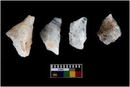 | Description / विवरण | Four utilised worked cores with sharp edges. Flakes removed from almost all the sides. Some are tapering at one end. |