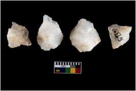 | Description / विवरण | Four utilised worked cores with sharp edges. Flakes removed from almost all the sides. Some are tapering at one end. |