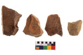 | Description / विवरण | There are n-4 of utilized flake cores. There are multidirectional irregular dominant scar pattern on both dorsal and ventral face of the cores. Some of them bulge of percussion and some are flat flake cores. |