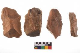 | Description / विवरण | There are n-4 of utilized flake cores. There are multidirectional irregular dominant scar pattern on both dorsal and ventral face of the cores. Some of them bulge of percussion and some are flat flake cores. |