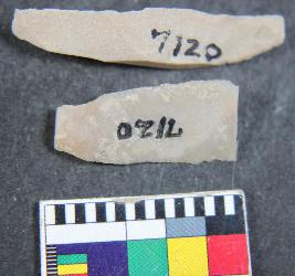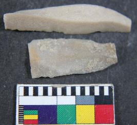 | Description / विवरण | Fragments of two different chert blade showing thick broad parallel sided, one dorsal is present, tringular in section and sharp cutting edges. Its surface is smooth. |
