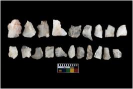 | Description / विवरण | There are n-20 of intact flake cores made up of Quartz. Some of them have bulge of percussion and some are flat flakes. |