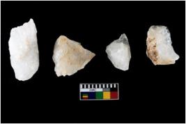 | Description / विवरण | Four utilised worked cores with sharp edges. Flakes removed from almost all the sides. Some are tapering at one end. |