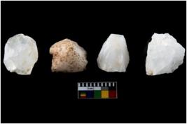 | Description / विवरण | Four utilised worked cores with sharp edges. Flakes removed from almost all the sides. Some are tapering at one end. |