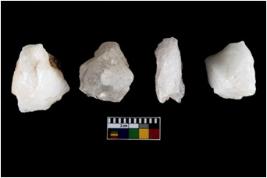 | Description / विवरण | Four utilised worked cores with sharp edges. Flakes removed from almost all the sides. Some are tapering at one end. |