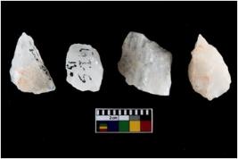 | Description / विवरण | Four utilised worked cores with sharp edges. Flakes removed from almost all the sides. Some are tapering at one end. |