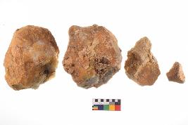 | Description / विवरण | There are n-4 of utilized flake cores. There are multidirectional irregular dominant scar pattern on both dorsal and ventral face of the cores. Some of them bulge of percussion and some are flat flake cores. |