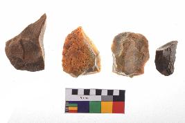 | Description / विवरण | There are n-4 of utilized flake cores. There are multidirectional irregular dominant scar pattern on both dorsal and ventral face of the cores. Some of them bulge of percussion and some are flat flake cores. |
