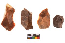 | Description / विवरण | There are n-4 of utilized flake cores. There are multidirectional irregular dominant scar pattern on both dorsal and ventral face of the cores. Some of them bulge of percussion and some are flat flake cores. |