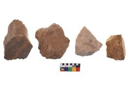 | Description / विवरण | There are n-4 of utilized flake cores. There are multidirectional irregular dominant scar pattern on both dorsal and ventral face of the cores. Some of them bulge of percussion and some are flat flake cores. |