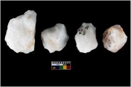| Description / विवरण | Four utilised worked cores with sharp edges. Flakes removed from almost all the sides. Some are tapering at one end. |