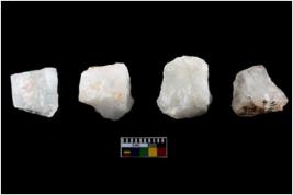 | Description / विवरण | Four utilised worked cores with sharp edges. Flakes removed from almost all the sides. Some are tapering at one end. |