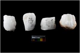 | Description / विवरण | Four utilised worked cores with sharp edges. Flakes removed from almost all the sides. Some are tapering at one end. |