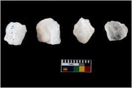 | Description / विवरण | Four utilised worked cores with sharp edges. Flakes removed from almost all the sides. Some are tapering at one end. |