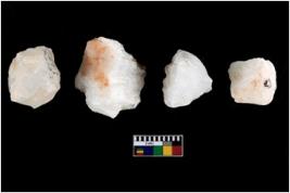 | Description / विवरण | Four utilised worked cores with sharp edges. Flakes removed from almost all the sides. Some are tapering at one end. |