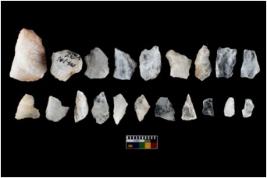 | Description / विवरण | There are n-20 of intact flake cores made up of Quartz. Some of them have bulge of percussion and some are flat flakes. |