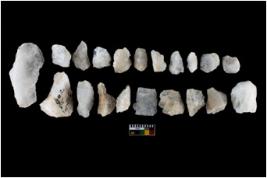 | Description / विवरण | There are n-20 of intact flake cores made up of Quartz. Some of them have bulge of percussion and some are flat flakes. |