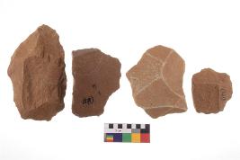 | Description / विवरण | There are n-4 of utilized flake cores. There are multidirectional irregular dominant scar pattern on both dorsal and ventral face of the cores. Some of them bulge of percussion and some are flat flake cores. |