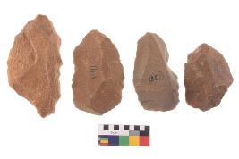 | Description / विवरण | There are n-4 of utilized flake cores. There are multidirectional irregular dominant scar pattern on both dorsal and ventral face of the cores. Some of them bulge of percussion and some are flat flake cores. |