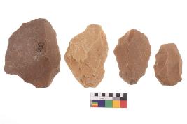 | Description / विवरण | There are n-4 of utilized flake cores. There are multidirectional irregular dominant scar pattern on both dorsal and ventral face of the cores. Some of them bulge of percussion and some are flat flake cores. |