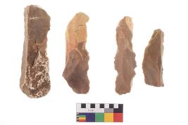| Description / विवरण | There are n-4 of utilized flake cores. There are multidirectional irregular dominant scar pattern on both dorsal and ventral face of the cores. Some of them bulge of percussion and some are flat flake cores. |