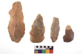 | Description / विवरण | There are n-4 of utilized flake cores. There are multidirectional irregular dominant scar pattern on both dorsal and ventral face of the cores. Some of them bulge of percussion and some are flat flake cores. |