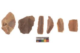 | Description / विवरण | There are n-6 of utilized flake cores. There are multidirectional irregular dominant scar pattern on both dorsal and ventral face of the cores. Some of them bulge of percussion and some are flat flake cores. |