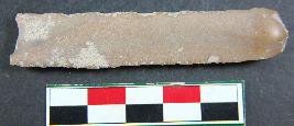 | Description / विवरण | Fragment of chert blade showing thick broad parallel sided, two dorsal is present, trapezi in section and sharp cutting edges. Its surface is smooth. |